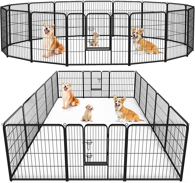 Sweetcrispy Dog Playpen Indoor - Pet Fence Exercise Pen for Yard Gate 16 Panels Foldable Puppy Playpens with Doors Metal Dog Pen for Camping, RV, Outdoor, Small/Medium/Large Pets, 32” Height
