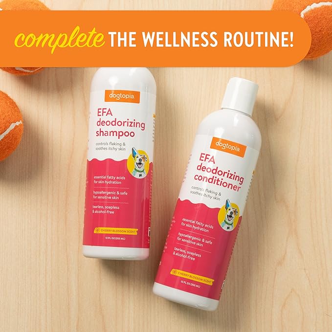 - With its gentle formulation and incredible cherry blossom scent, Dogtopia’s EFA Deodorizing Conditioner will keep your pet’s coat soft, comfortable, and smelling fresh.