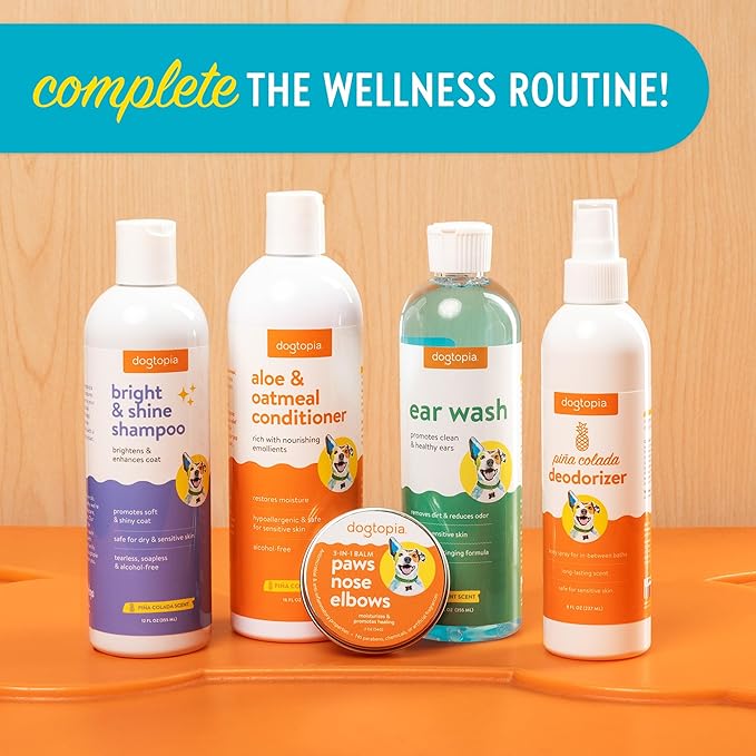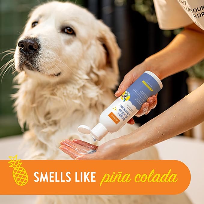 - With its gentle formulation and tropical piña colada scent, Dogtopia’s Bright and Shine Shampoo will keep your pet soft, radiant, and smelling fresh.