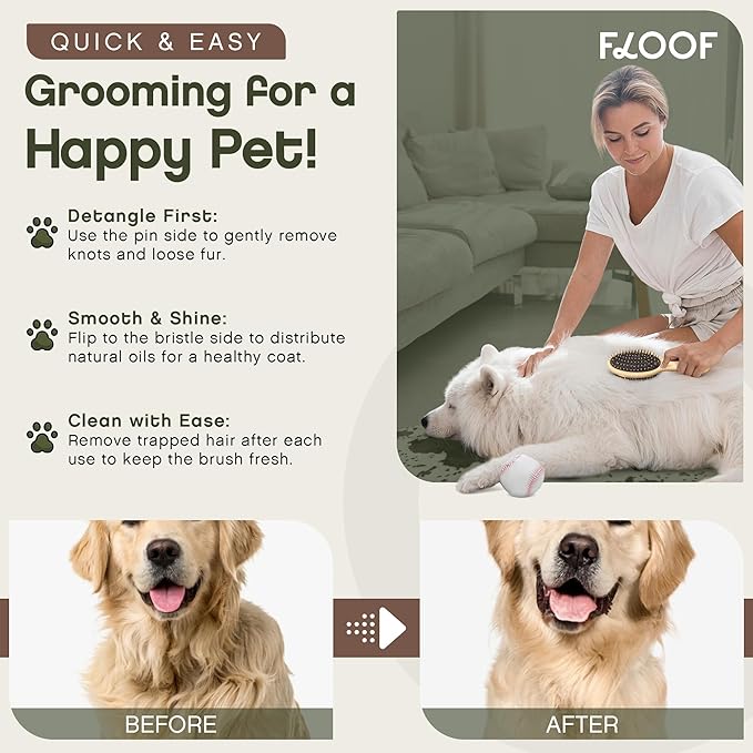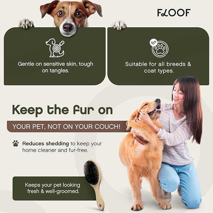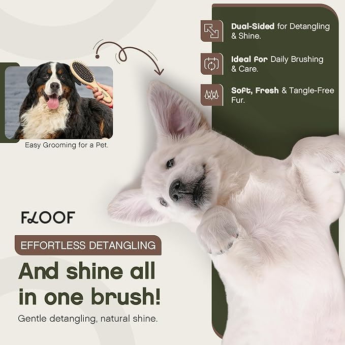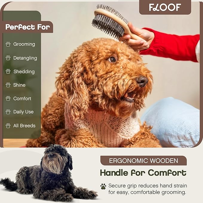 Floof Double-Sided Pet Brush,Metallic Pins & Vegan Boar Bristles for Long & Short Haired Dogs and Cats | Premium Wooden Handle for Comfort | Eco-Friendly Deshedding,Gentle Detangling,& Easy to Clean