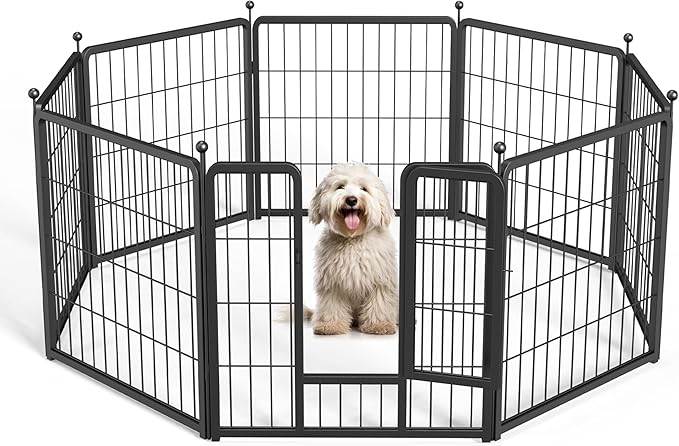 - 【Upgraded Dog Playpen】Playpen dog for medium dogs adopts gravity door lock design, much safer and more convenient. Made of heavy duty metal panels and stakes with black coating, non-toxic, anti-rust. Ensures long time use no matter indoor or outdoor.