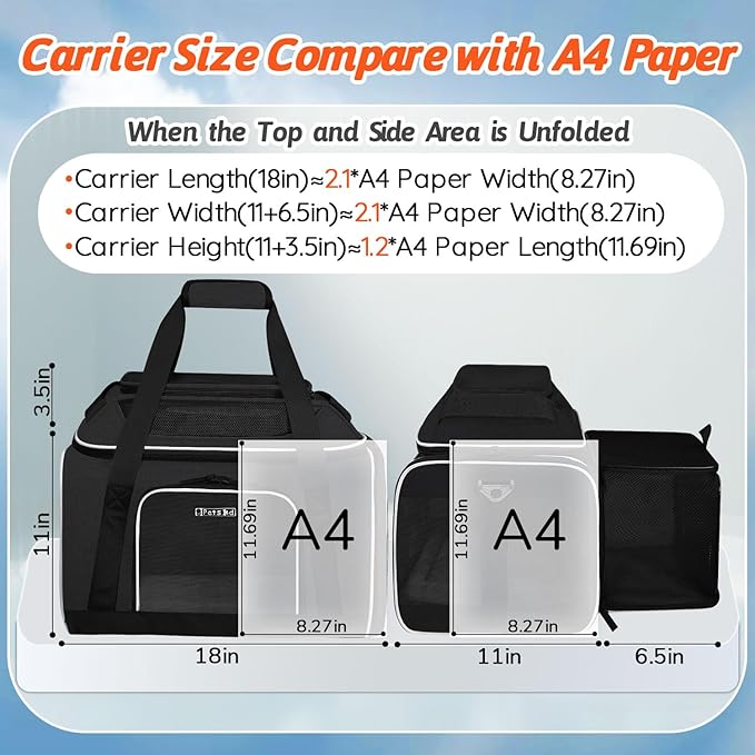 - 【AIRLINE APPROVED CARRIER 】Unfolded size:18"L×(11+6.5)"W×(11+3.5)"H, Petskd pet carrier is TSA approved and can be placed under the seat in the cabin, it is mainly designed for ①Delta Airlines:18x11x11" ②United Airlines:18x11x11" ③AA:18x11x11". We recommend you buy this carrier when you fly with the above-mentioned airlines.