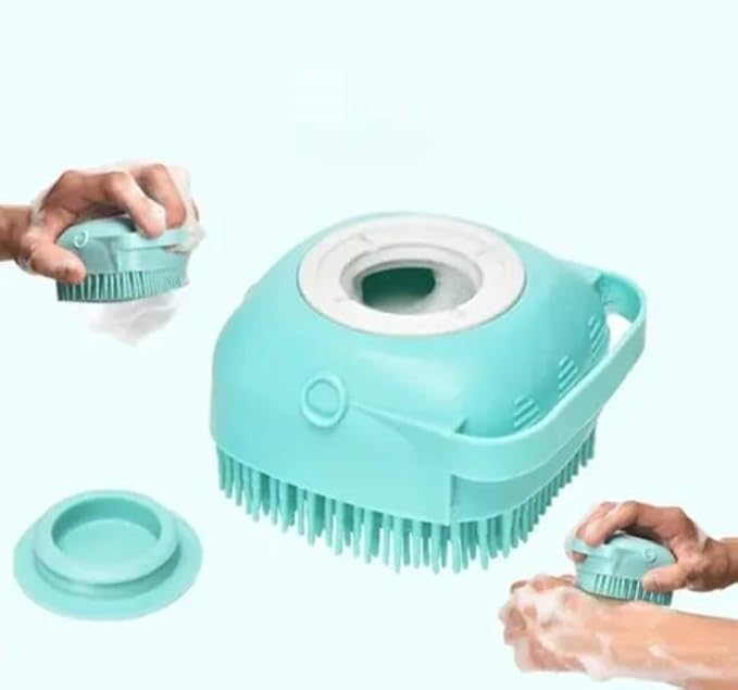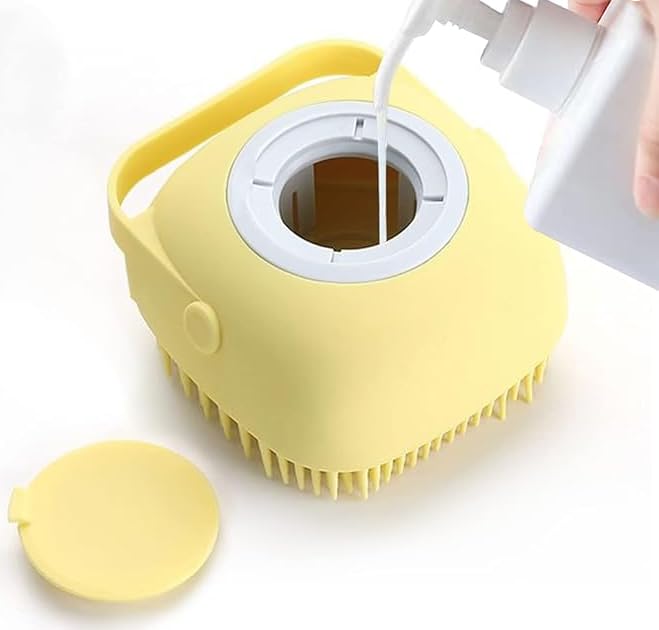 Pet Grooming Bath Massage Brush with Soap and Shampoo Dispenser, Soft Silicone Bristles for Long/Short Hair Dogs & Cats, Shower, Yellow