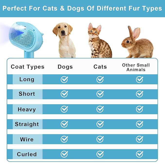 - Spray Cleaning: Equipped with a water tank and LED blue light, the brush gently Spray and loosens stubborn pet hair for effortless grooming.the LED blue light sterilization and disinfection