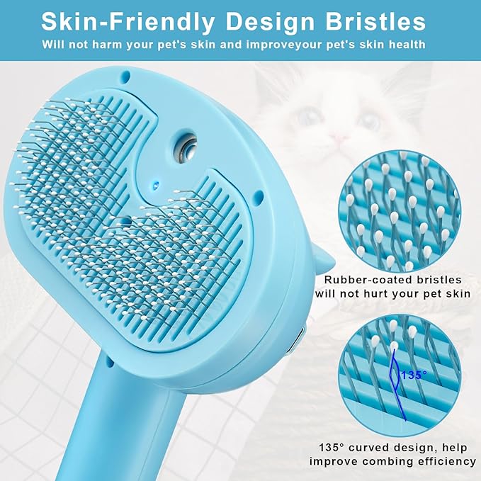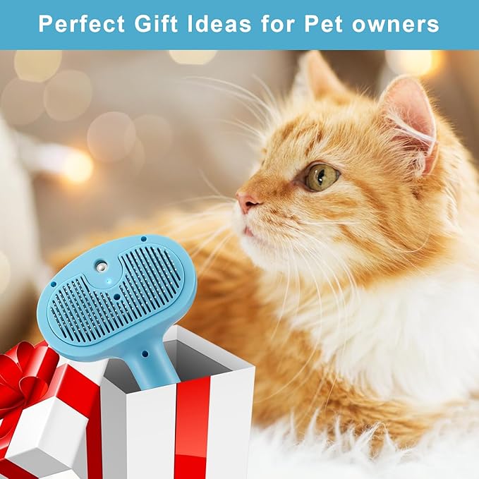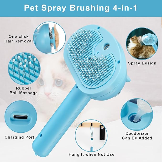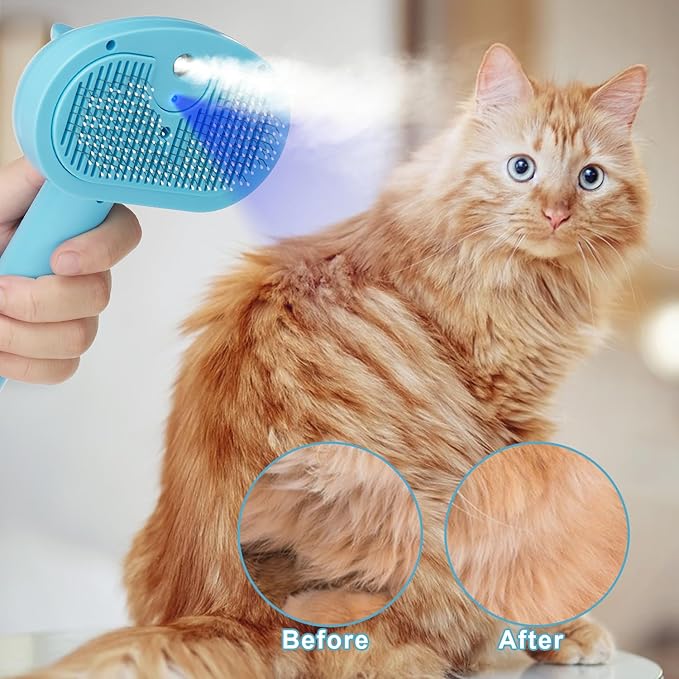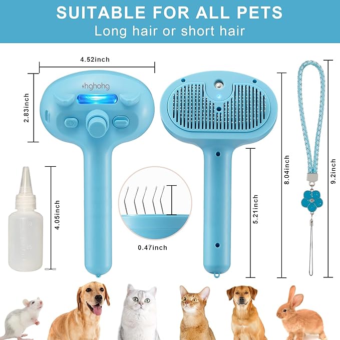 Pet Steam Hair Comb Brush for Shedding, 4 In 1 Spray Brush for Long & Short Haired Cat&Dog, Self-Cleaning Hair Remover with Water Tank And LED Blue Light, Release Button(Blue)