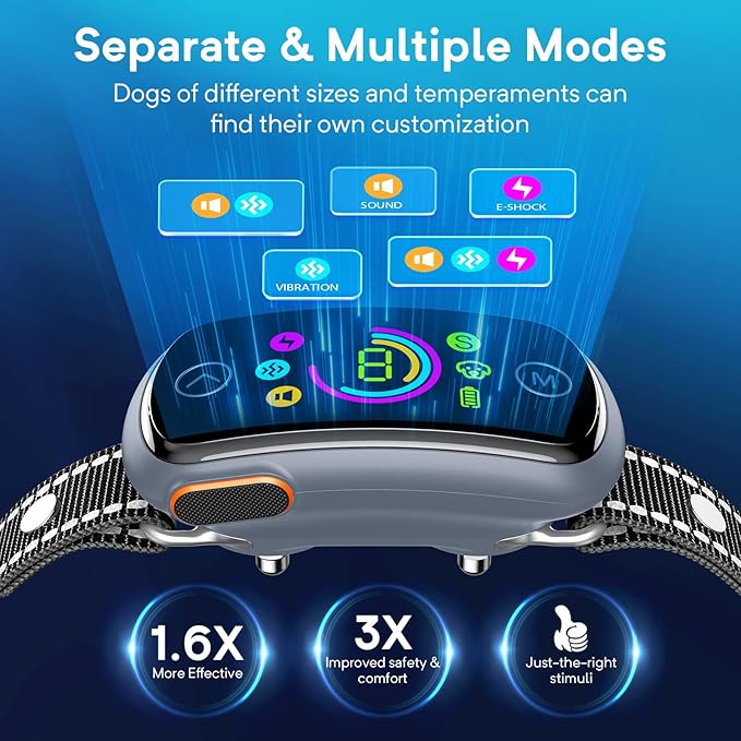 - Reliable and Safe Bark Control Solution: Our bark collar for large dog offers unparalleled flexibility with three user-selected modes: beep (0-3 level), vibration (0-7 level), and shock (0-7 level). Customize the intensity to meet your dog’s unique needs, ensuring a secure and effective way to stop barking with just-the-right stimuli. With a 1.6X improvement in correction efficiency and 3X enhanced comfort, experience a quieter and happier environment for you and your pet