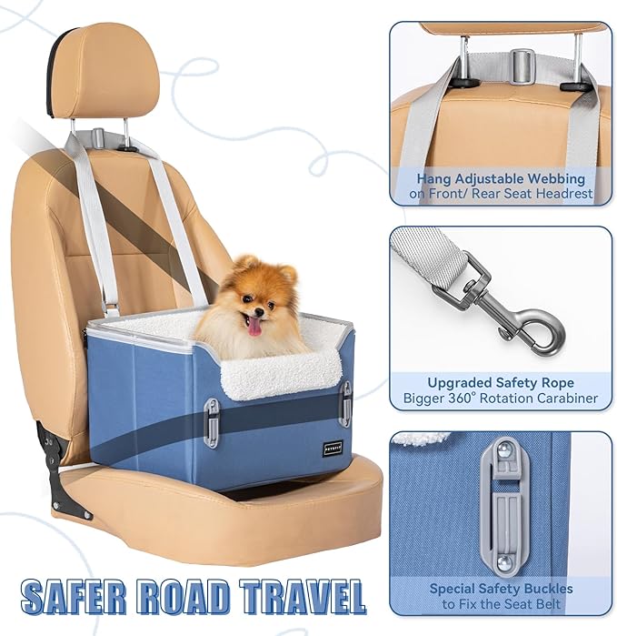 - [Safety First] The small dog car seat allows your little one to stay comfortable and secure without disturbing you when you driving. The adjustable clip-on leash is hidden under the removable booster cushion, it hooks the dog's harness to prevent the pet from jumping out. patentedbuckles provide more stable security for your travel.