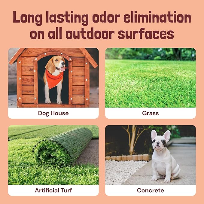 - For All Outdoor Surfaces: Use our turf odor eliminator for dogs, as a real or fake grass cleaner, or even to refresh the dog house. This powerful outdoor odor eliminator for dogs is a one-stop-shop for keeping all outdoor surfaces clean & fresh