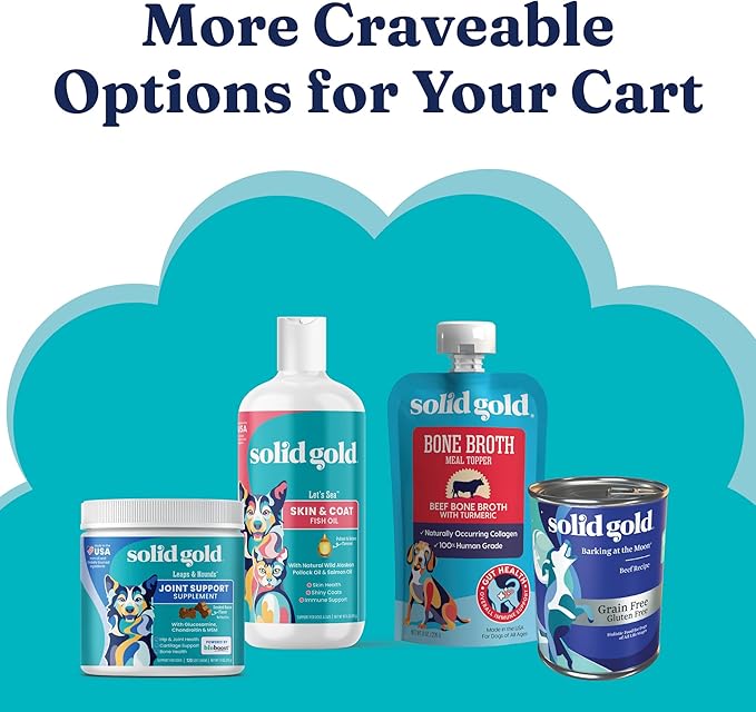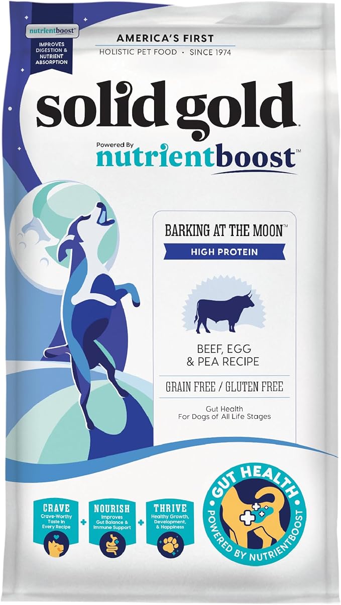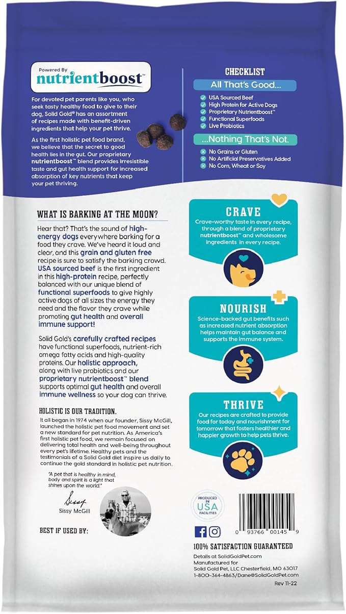 - Bark This Way! - Solid Gold nutrientboost Barking at the Moon is a grain and gluten free dry dog food with protein and other nourishing ingredients to support any adult small, medium, and large breed.