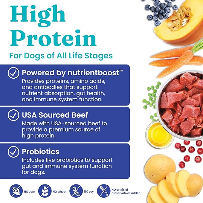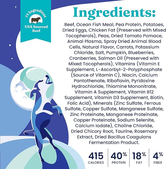 - High Protein Dog Food with Low Carbs - This craveable kibble dog food recipe provides high protein for dogs (41%) from USA sourced beef to support muscle health for your active canine companion.