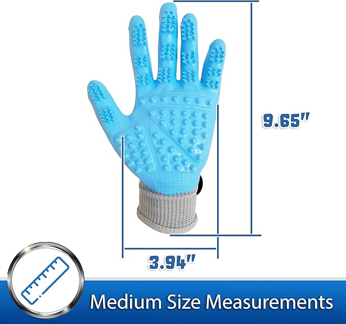 - Two Sizes: Our grooming gloves are available in two sizes, medium and large, to ensure a comfortable fit for different hand sizes. The medium size has a palm width of 3.94 inches and a length of 9.65 inches, while the large size has a palm width of 4.33 inches and a length of 10.43 inches. Additionally, the gloves are adjustable, allowing you to customize the fit to your liking.