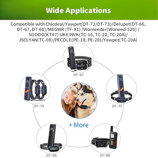 - Compatible Devices : NVK (TC-20A, TC-16, TC-20), UKE, Delupet (DT-66, DT-67, DT-68), Yawpet (DT-72/DT-73, TC-20A), Chicdeal, PECOLE (PE-18, PE-28), SODOG (KT47), Worneeder (Woneed-520), MEGWR (TF-X1), JSCLYAN (TC-08) Dog Shock Collar and Remote NVK (TC-20A, TC-16, TC-20), UKE, Delupet (DT-66, DT-67, DT-68), Yawpet (DT-72/DT-73, TC-20A), Chicdeal, PECOLE (PE-18, PE-28), SODOG (KT47), Worneeder (Woneed-520), MEGWR (TF-X1), JSCLYAN (TC-08) Dog Shock Collar and Remote