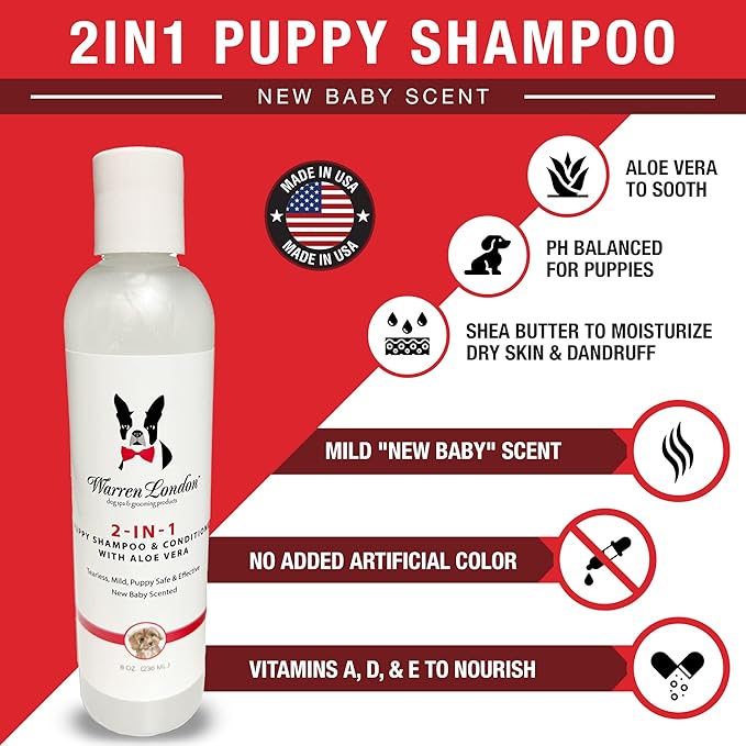 - 2-in-1 Puppy Shampoo & Conditioner with Aloe: Gently cleanse and condition your puppy's coat with our all-in-one formula enriched with aloe to leave fur soft, shiny, and tangle-free.
