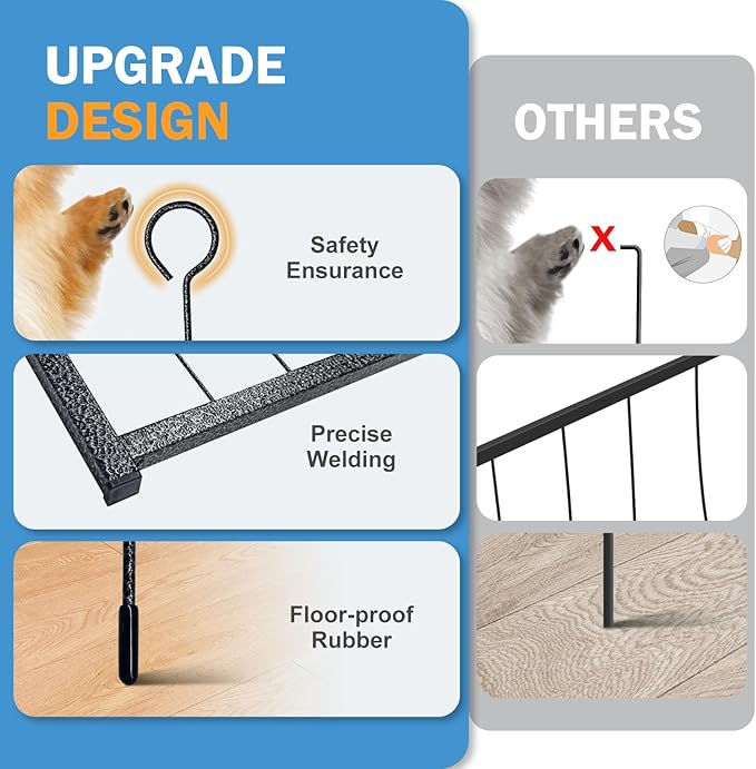 - New Design: The upgraded dog playpen designed with automatic lock with the gravity mechanism differ from traditional door latches, prevent your smart dog unlocking by themselves. Also sharpen the bottom of robs to be more easily inserted into the ground, provides greater stability and rigidity. The stakes with spherical top to protect your dog's claws from injury.