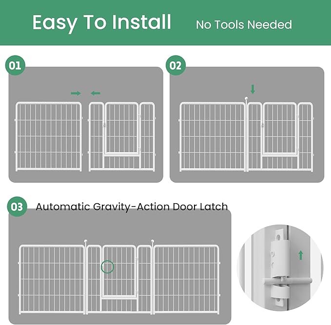 - 【Upgraded Dog Playpen】Dog playpen indoor adopts gravity door lock design, much safer and more convenient. Made of heavy-duty metal panels and stakes with black coating, non-toxic, anti-rust. Ensures long-time use no matter indoor or outdoor.