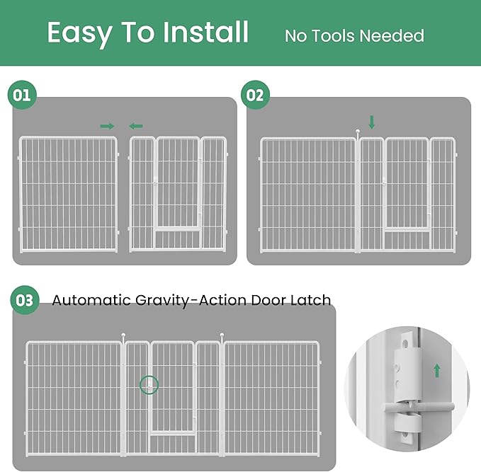 - 【Safe & Free Space】Offering enough space for your pets to play and exercise. The automatic gravity-actioned locking can keep your pets safe and prevent them from rushing out of the door. The stakes with round ball tips protect you and animals from injury.