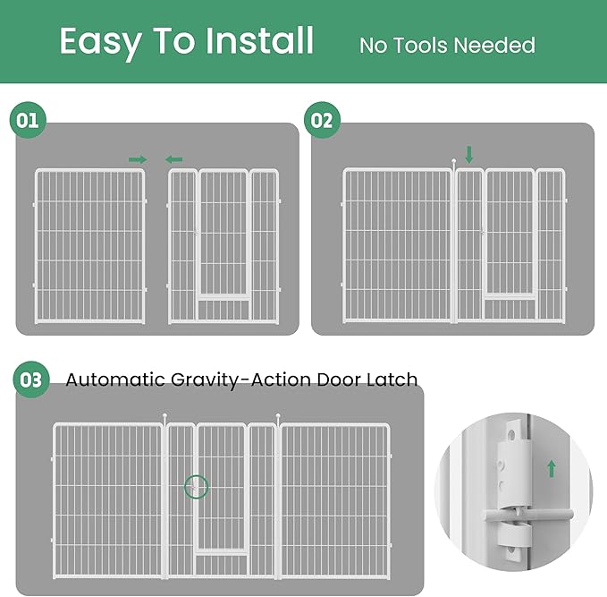 - 【Safe & Free Space】Offering enough space for your pets to play and exercise. The automatic gravity-actioned locking can keep your pets safe and prevent them from rushing out of the door. The stakes with round ball tips protect you and animals from injury.