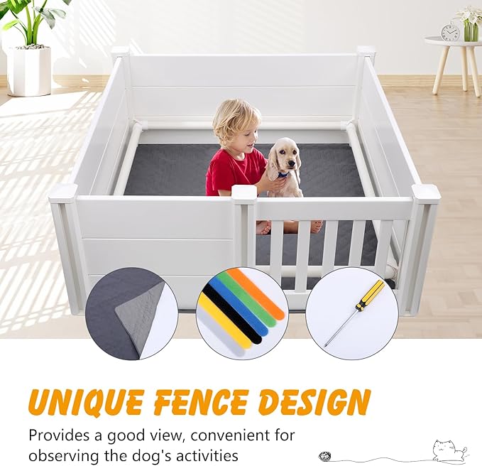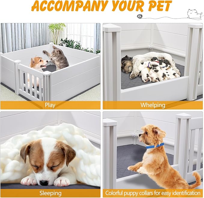 - INTIMATE ACCESSORIES - The dog whelping pen is equipped with a waterproof mat to keep the internal environment clean, easy to clean, and prevent dirtying the floor. 6 ID collars are easy to distinguish puppies. Suitable for small dogs.