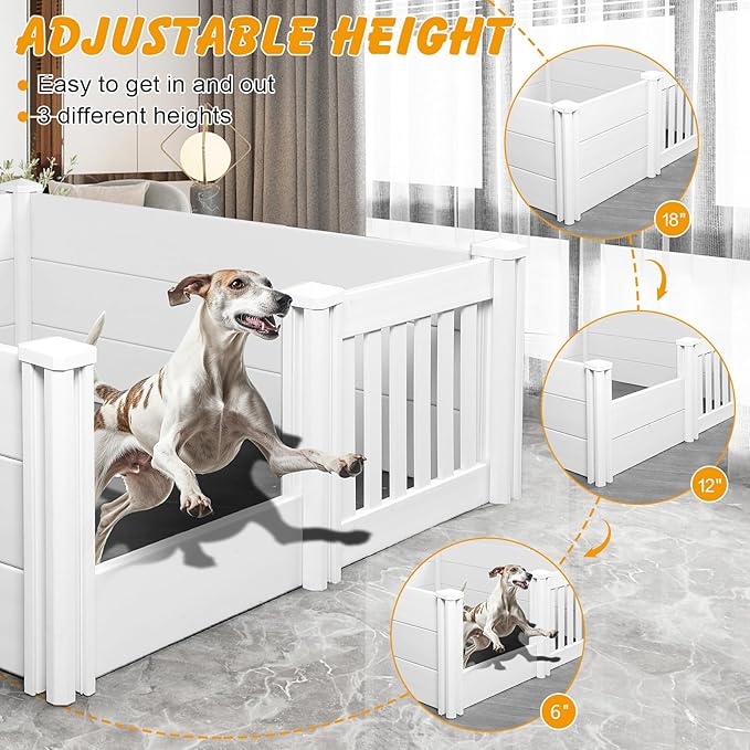 - ADJUSTABLE HEIGHT BOARD - The entrance of the puppy whelping box is adjustable, which can be adjusted to 1/3 height, 2/3 height and completely closed to prevent puppies from escaping and facilitate the mother dog to enter and exit.