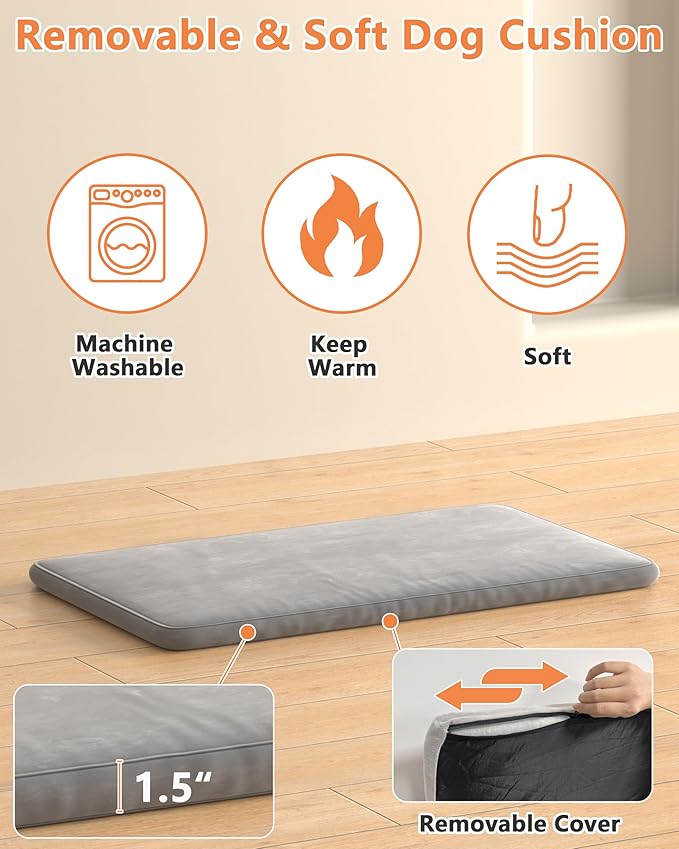 - ?�Dog Crate with Cushion??Imagine your furry child in this dog crate with a specially customized mat that is like a warm blanket for his cot for the cold nights. This mat is removable for machine washing and very easy to clean. The bottom of this dog crate is made of sturdy wooden boards, so you don't have to worry about your dog's little feet getting stuck in the crevices at all, so that your baby can sleep more peacefully.