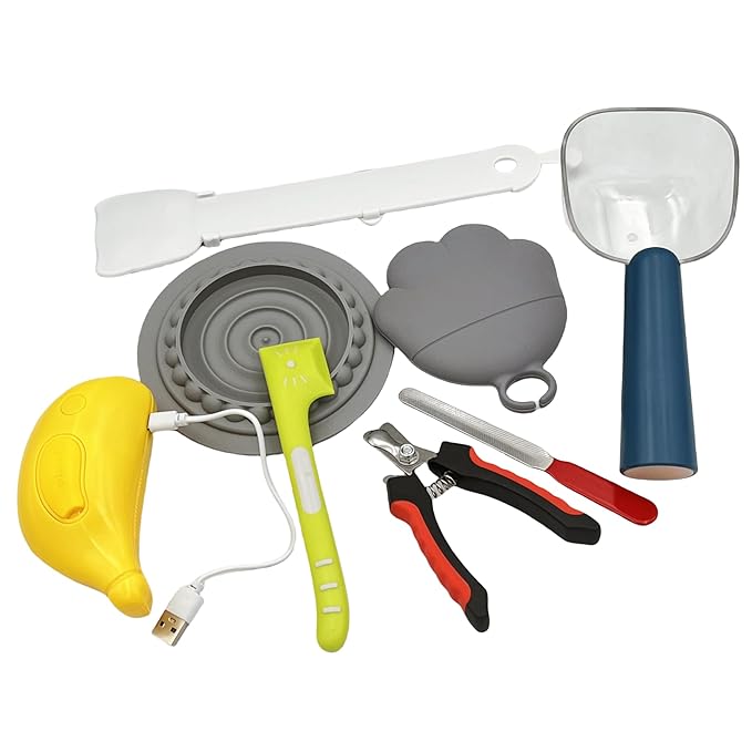 - COMPLETE KIT: 8-piece pet grooming set includes steam brush, nail clipper and file, food scoops, can lid cover, and slow feeder bowl for dogs and cats.