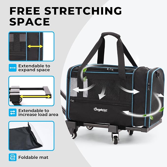 BurgeonNest Expandable Premium Cat Carrier with Wheels - Handle Adjustable Small Dog Carrier- Designed for Dogs and Cats up to 15 lbs - Removable Soft Lined Pet Carrier
