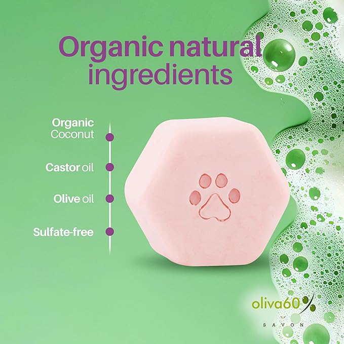 - NATURAL AND GENTLE INGREDIENTS | Crafted with a blend of nourishing oils including olive, castor, and organic coconut, our shampoo bar is sulfate-free, ensuring a gentle yet effective cleanse for your dog's delicate coat.