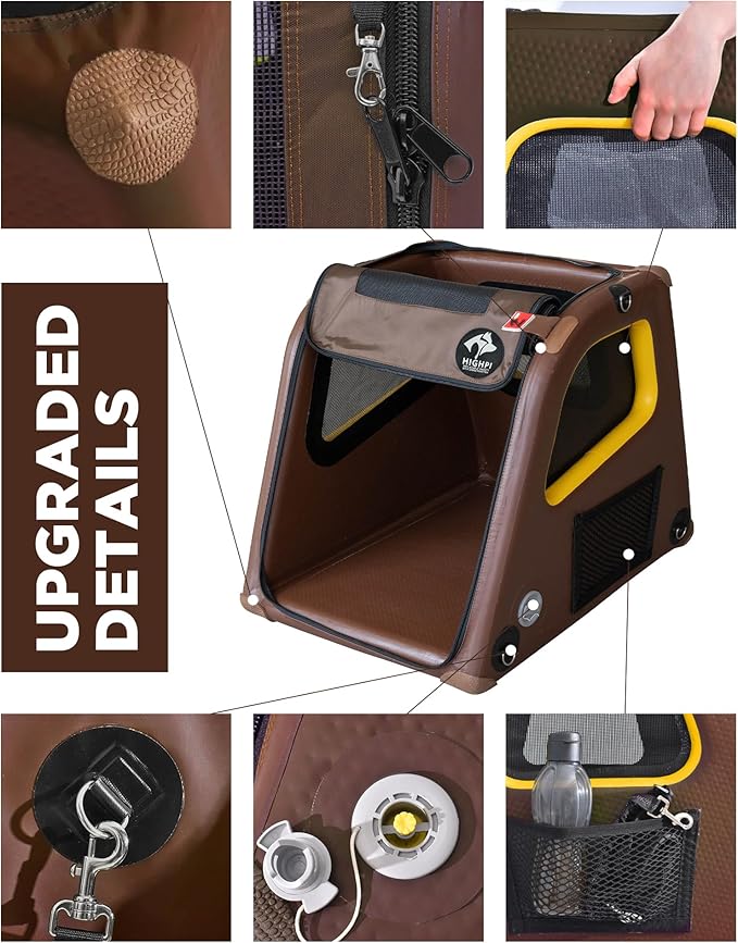 - 【AIRBAG FUNCTION AIR FLOOR CUSHIONING】HIGHPI inflatable soft dog crate for car offers "airbag function" to maximum impact safety for dogs during travel in case of emergency braking or sudden evasive movement. This dog travel crate have passed the crash test with flying colors! Your dog is protected by 4cm thick air chambers!This dog kennel outdoor has a sturdy inflatable 4cm thick floor which offers perfect cushioning and absolutely comfortable transport for your furry companion.