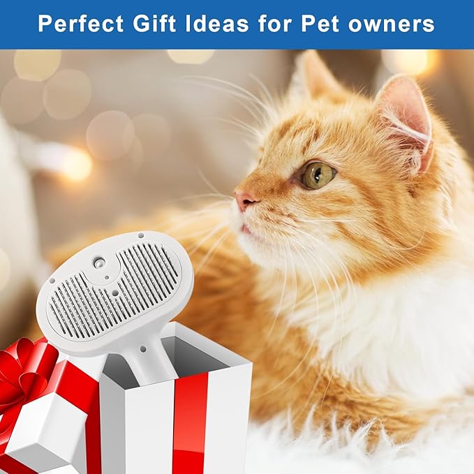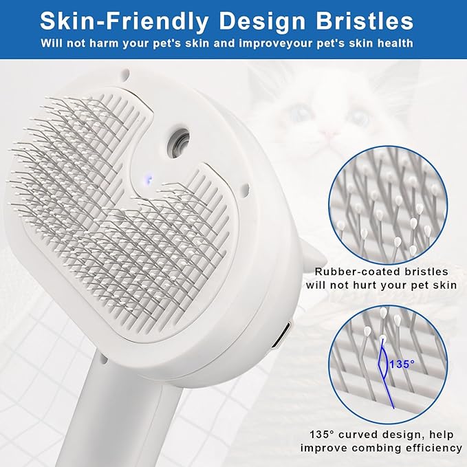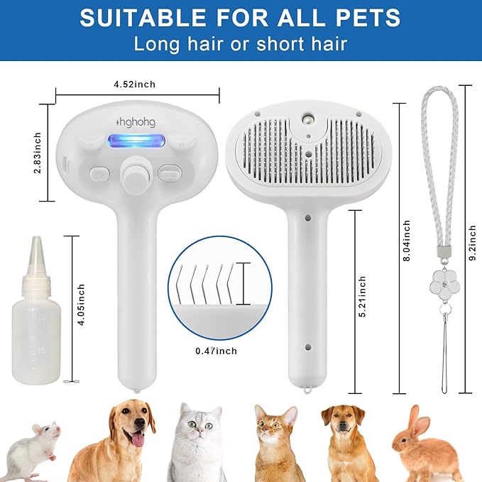 Pet Steam Hair Comb Brush for Shedding, 4 In 1 Spray Brush for Long & Short Haired Cat&Dog, Self-Cleaning Hair Remover with Water Tank And LED Blue Light, Release Button (White)