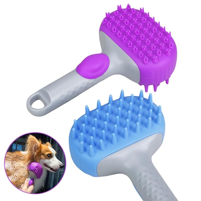 QMEAKMONY Dog Bath Brush Shampoo Brush Scrubber for Bath with Soap Dispenser Soft Bristles Deep Cleaning Ergonomic Handle for Grooming Shedding and Long Short Haired Dogs (Blue Purple)