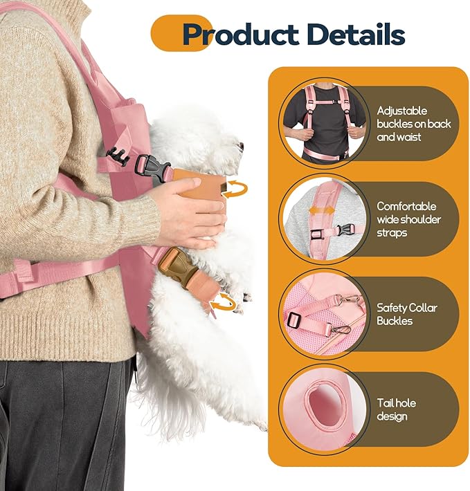 - Comfort and Safety: The thick pearl cotton padding and soft, breathable mesh fabric ensure your pet's comfort. With more room than traditional dog backpacks, it provides better ventilation to keep your pet cool. Additionally, the widened shoulder straps and adjustable chest and waist straps distribute weight evenly, enhancing safety. An interior safety collar strap offers extra security for your pet