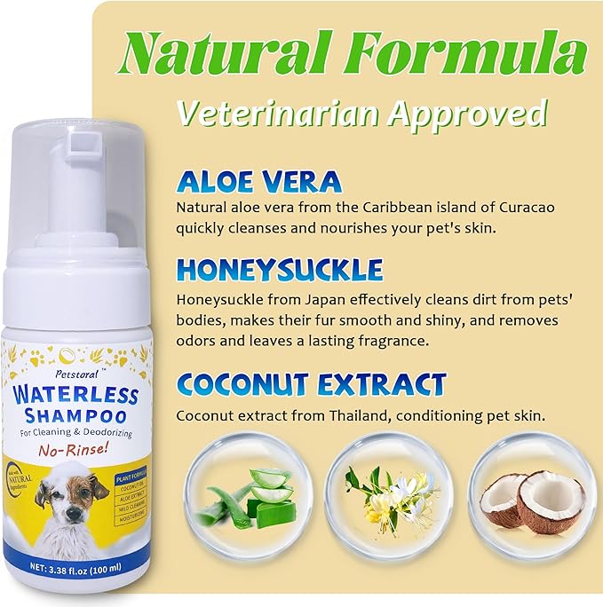 Waterless Dog Shampoo No Rinse Puppy Dry Hypoallergenic Shampoo and Conditioner - Soothing and Deodorizing Quickly Cleans Smelly Dogs and Cats (3.38 fl oz/100ml)