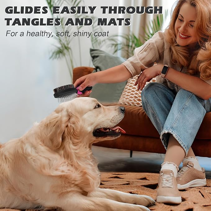 - 🐾【Double Sided Dog Hair Brush】The stainless steel pin brush removes pet hair effectively while the air-cushioned design massages the skin, promoting circulation without causing harm. The nylon brush side adds shine and health to the coat. Ergonomic handle for comfortable use.