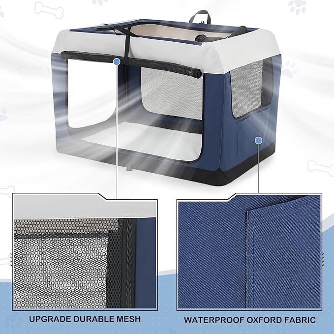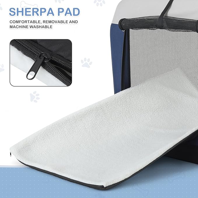 - Robust & Portable Crate Design: Engineered with a lightweight steel frame, durable Oxford cloth, and anti-bite mesh, our travel dog crate offers superior durability and safety; It features reinforced stitching and a washable sherpa mat for comfort, making it both secure and easy to transport for your pet's relaxation and protection