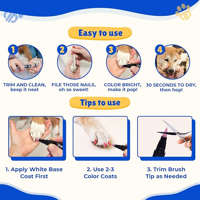 - INCLUDED NAIL FILE: Each dog nail polish pen set comes with a nail file to make grooming and beautifying your pet a breeze. The file helps achieve a smooth, durable, and shiny finish, enhancing the overall look of your pet's nails.