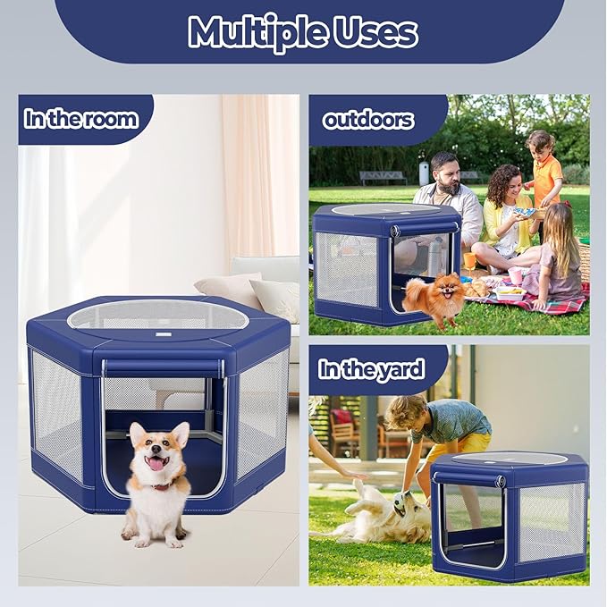 - đ¶ăAmple Space and Visibilityă- The design offers ample space for your puppy to move around freely. Our fence is convenient for the owner to carry the dog in and out, breathable space for the dog, the transparent nature of the mesh cloth allows for good visibility, so your pet doesn't feel isolated while still being contained. It gives them a sense of security while allowing you to keep an eye on them. and the Upward rolling door design is convenient for the dog to enter and exit the door.
