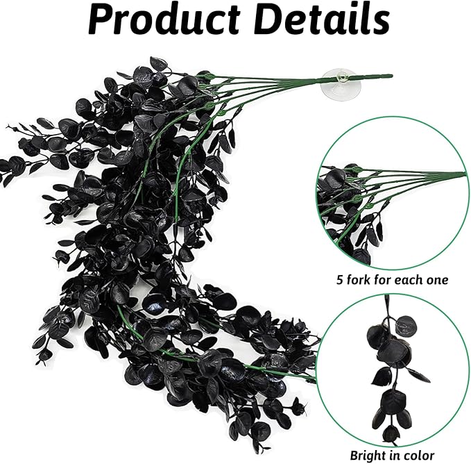Hamiledyi Reptile Plants, 2 Pack Hanging Terrarium Plants, Artificial Leaves Habitat Decorations with Suction Cup, Fake Amphibian Plants for Bearded Dragon Lizard Hermit Crab Geckos Chameleon(Black)