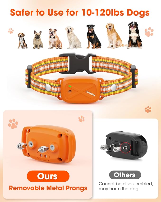 - 【3 Humanized Modes, Eliminate Bad Behavior Effectively】 Jugbow vibration collars features 3 humane training modes: beep(1 level), vibration(1-9 levels), safe static(0-99 levels), which can be tailored to match your dog's temperament and sensitivity, deterring dogs from undesirable habits.