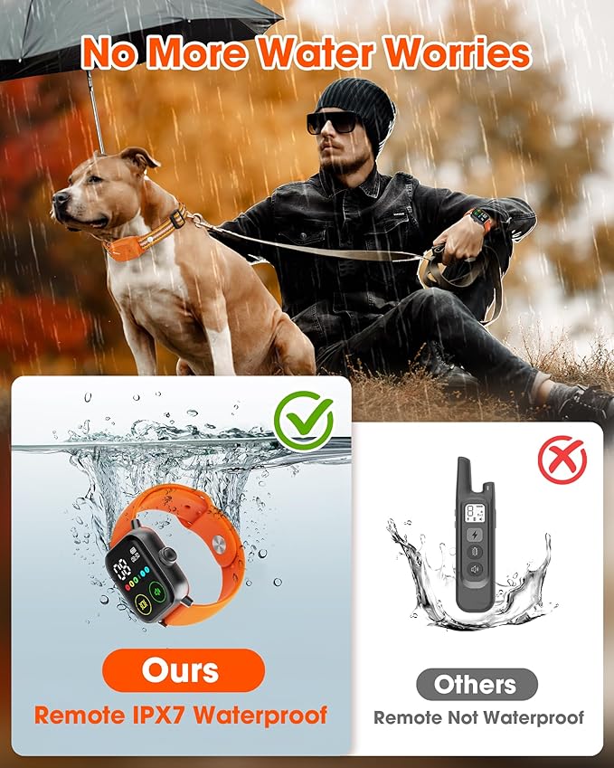 - 【Remote IPX6 & Collar IPX7 Waterproof】 The IPX6 waterproof remote allows you to control your dog's training sessions effortlessly, regardless of rain or splashes. Our training collar is IPX7 waterproof, you can confidently train your dog without worrying about water damage. Discover the convenience and versatility of our waterproof device today!