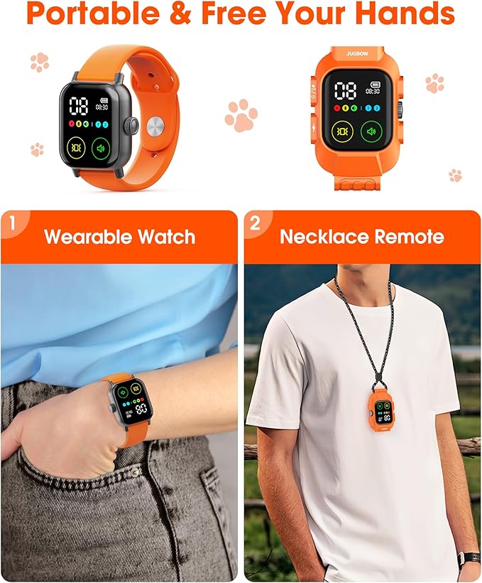 - 【Watch-Style Remote with HD Touch Screen】 Jugbow training collar with wearable remote control is more convenient and portable, offers 2 ways to wear it (on the hand like a watch or around the neck). Designed with color touch screen and display 24H Time, you can directly operate the training mode and watch time on your wrist. Say goodbye to traditional training remote and embrace this sleekly designed remote!