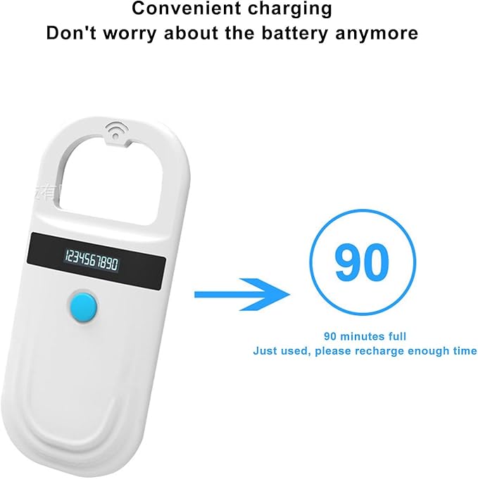 - LONG BATTERY LIFE: Our Pet ID Scanner is equipped with a high-capacity 3.7V lithium battery to extend battery life, and is equipped with a USB2.0 interface data cable, which can be conveniently charged within 90 minutes (full charge for the first use); the side also has an anti-slip function to ensure a firm grip