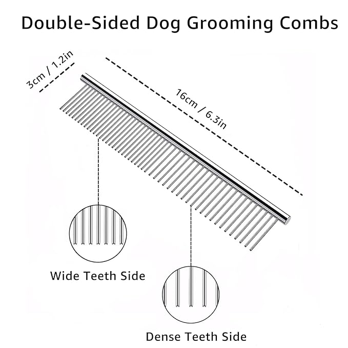 - 【2-in-1 Comb】: Wide sided for comb knot, smoothing and modeling your pet's hair, dense side for removal of loosen hair, you can use it on the legs, head or tail of your pets where the brush can’t