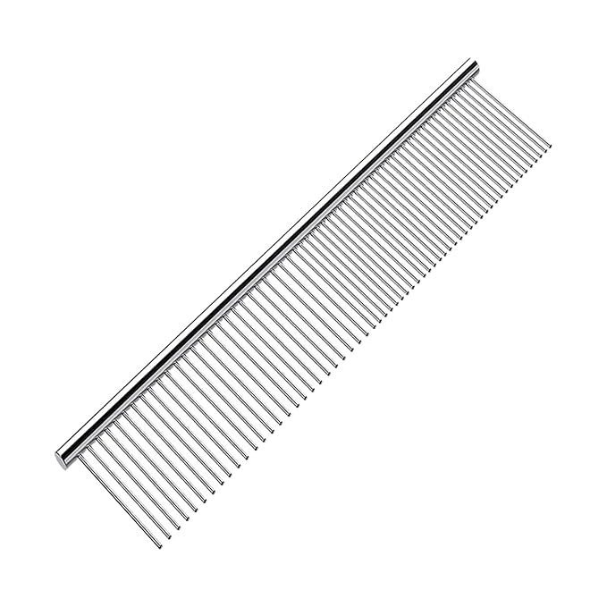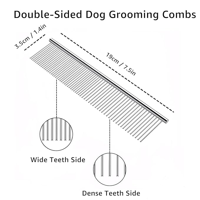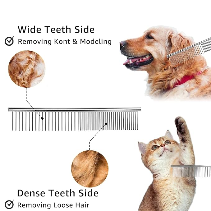 - 【2-in-1 Comb】: Wide sided for comb knot, smoothing and modeling your pet's hair, dense side for removal of loosen hair, you can use it on the legs, head or tail of your pets where the brush can’t