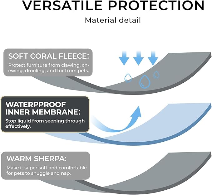 - TRIPLE LAYERS DESIGN - Soft thick fleece on one side and plush sherpa backing on the other to keep your pets comfy, warm and dry. Internal waterproof lining provides defense and stops liquids from seeping through. NOTE: The surface of the fiber itself is not waterproof!