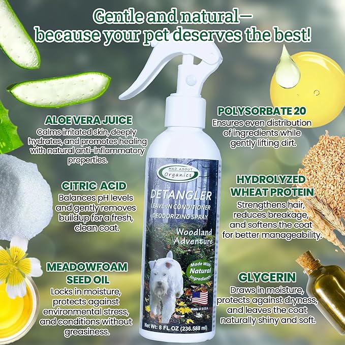 - Pleasant Woodland Adventure Scent: With a blend of cedarwood and natural scents, our detangling and deodorizing spray offers a lasting aroma, keeping dogs and horses smelling clean. An easy way to keep coats refreshed and soft between washes.