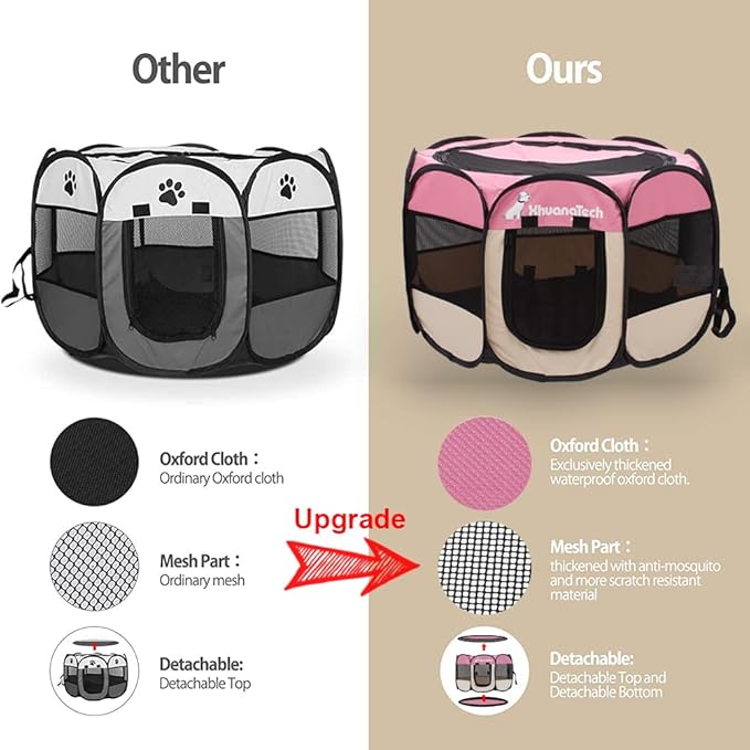 - Upgraded and Optimised: Compared with the old version, our new dog playpens have been upgraded and optimised in many ways. The thickened Oxford and PVC plastic mesh enhances its waterproof, mosquito, scratch and warmth protection of the dog play pen, and adds a removable bottom for easy cleaning.