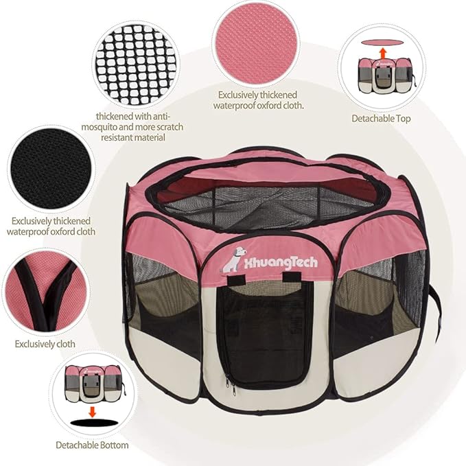 Foldable Pet Dog Playpen, Pop Up Portable Cat Playpen, Indoor/Outdoor for Kitten Puppy Play Pen, Cats Crate Tent with Carrying Bag, 600D Oxford (Pink + Beige, Medium (31.5"x31.5"x23"), 8)