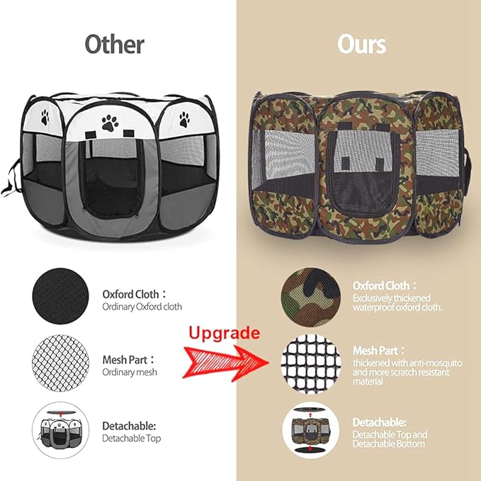 - Upgraded and Optimised: Compared with the old version, our new dog playpens have been upgraded and optimised in many ways. The thickened Oxford and PVC plastic mesh enhances its waterproof, mosquito, scratch and warmth protection of the dog play pen, and adds a removable bottom for easy cleaning.