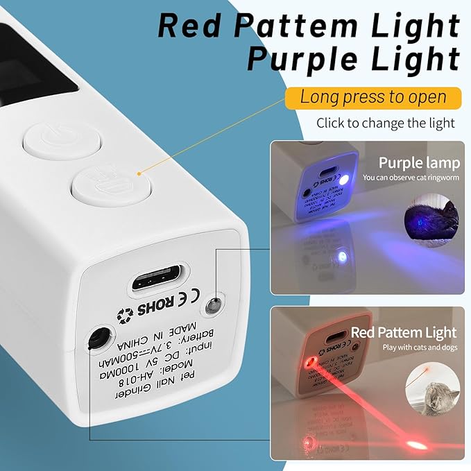 - 【Safe and Efficient Trimming】: This dog nail trimmers uses high-quality diamond roller drill bits, which have excellent grinding effects. It can also trim pet nails accurately, quickly, and smoothly, and reduce the risk of nail damage. The built-in UV light at the bottom helps you quickly discover the details of the pet's nails and effectively clean them while trimming.