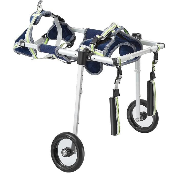 - Exclusive Design: The dog wheelchair has an aluminum frame, adjustable straps, EVA wheels, foam leg straps and a 1.5m/4.92ft dog leash. It's designed to help pets with disabled hind legs move comfortably outdoors.